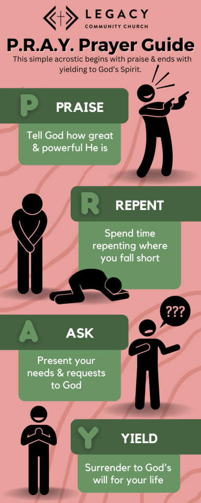 P.R.A.Y. is a simple acrostic that begins with praise and ends with submitting to God’s will for your life.